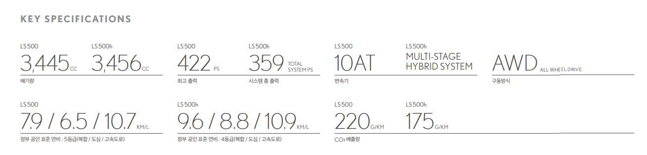 렉서스 LS 제원은 위와 같습니다.